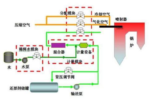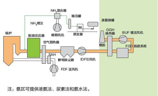 聯合工藝( SNCR-SCR ):兩段式反應:尿素或氨基化合物作為還原劑,爐膛內壁噴入過量的還原劑脫硝(SNCR反應區,反應溫度850~1100度),然后進入SCR反應區,利用余量的還原劑在反應溫度270~400度、SCR催化劑的條件下進一步脫硝。該工藝通常適用于循環流化床鍋爐,能夠在較低的投資下實現高效率。