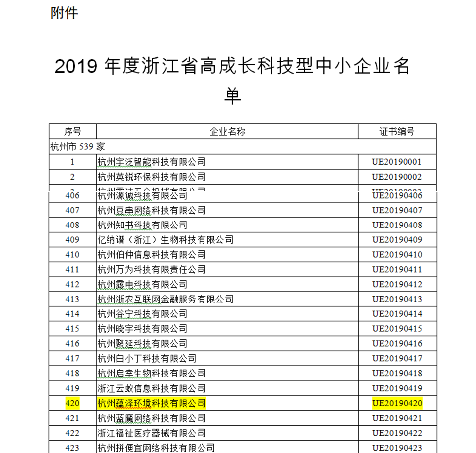 根據(jù)省科技廳印發(fā)的《浙江省高成長(zhǎng)科技型中小企業(yè)評(píng)價(jià)指導(dǎo)性意見(jiàn)》(浙科發(fā)高〔2016〕87號(hào))和《關(guān)于組織開(kāi)展2019年度高成長(zhǎng)科技型中小企業(yè)評(píng)價(jià)的通知》(浙科發(fā)高〔2019〕46號(hào))有關(guān)規(guī)定,經(jīng)科技管理部門(mén)組織評(píng)價(jià)、研究決定,評(píng)選結(jié)果客觀、真實(shí),如實(shí)反映了企業(yè)的綜合實(shí)力。“杭州蘊(yùn)澤環(huán)境科技有限公司”認(rèn)定為2019年度浙江省高成長(zhǎng)科技型中小企業(yè)。