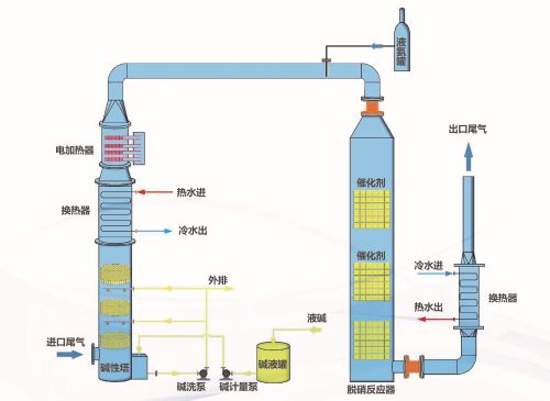 該工藝廢氣排煙溫度低于35℃,在進入脫硝反應器前先經過堿洗塔清洗,去除工藝廢氣中含有的少量HCl等酸性氣體,后進入加熱器升溫至合適溫度。一段加熱利用脫硝后的尾氣進行換熱,熱媒采用除鹽水;二段加熱采用電加熱器。最終達到低溫催化劑的理想溫度范圍:100~150℃。經加熱后的工藝廢氣進入脫硝反應器發生還原反應,生成氮氣和水。